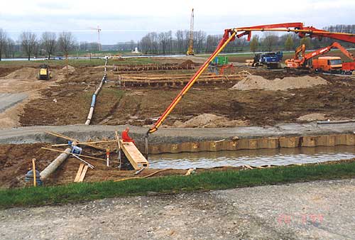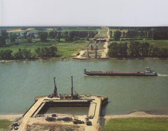 dazu werden die Strompfeiler auf beiden Rheinseiten gebaut, auf denen die