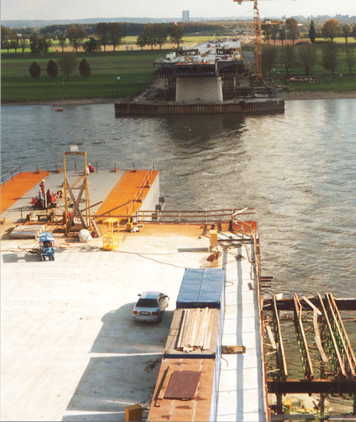 In den Werkstätten werden möglichst große Stahlbauteile vorgefertigt. Der Vorteil liegt darin, dass auf der Baustelle erheblich weniger Schweißnähte ausgeführt werden müssen und umfangreiche Anpassungsarbeiten entfallen können . Nachdem die Stahlteile den erforderlichen Korrosionsschutz erhalten haben, werden sie auf dem Wasserweg zur Einbaustelle transportiert. Als erstes werden die quer zur Fahrbahn verlaufenden Verbindungsträger antransportiert. Bedingt durch die großen Kräfte (die Pylonlasten und die Lasten aus den Brücken) werden die Träger als ein Stück (425 Tonnen) gefertigt und per Schwimmkran auf die Strompfeiler aufgesetzt. Nun können die Pylone errichtet werden. Diese bestehen aus den senkrechten Stielen (V-Pylon) und den längs zur Fahrbahn verlaufenden Riegeln. Wegen der großen Gewichte werden die Stiele in 3 Einzelteilen und die Riegel in 2 Einzelteilen gefertigt und über die Straße zur Einbaustelle transportiert. Ihre Montage erfolgt mit einem 800 Tonnen-Autokran. Dessen Standort ist auf der Vorlandbrücke genau berechnet. Der Bau der Stahlbrücke erfolgt in 12 Teilen - genannt Schüsse - mit einem Schwimmkran, synchron von der rechten und der linken Rheinseite aus, ebenso die Montage der Seilgruppen. Die Fahrbahnplatten werden per Autokran von der Brücke aus auf die Unterkonstruktion montiert. Nach dem Schließen der Brücke - die westliche Brückenhälfte wird um 10 cm geschoben - werden evtl. erforderliche Korrekturen in den Seilkräften und in den Gradienten ausgeführt.