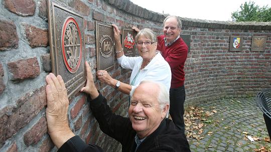 Ulrich Fink (hinten), Brigitte Ohlings und Hans Wilhelm Webers vom Bürgerverein Nierst sind stolz auf ihren großen Gemeinschaftssinn im Ort. Die Tafel mit den Vereinsemblemen ist nur ein Beispiel dafür. FOTO: Ulli Dackweiler