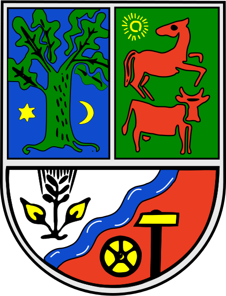Blasonierung: Das Wappen ist halbgespalten und geteilt, zeigt im ersten Feld eine grüne Eiche auf blauem Grund (für den Waldreichtum der Region) mit Stern und Mond (für die keltischen Siedler der Frühzeit), im zweiten Feld ein rotes Pferd und eine rotes Rind (für die am Ort übliche Viehzucht) auf grünem Grund mit einer Sonne. Der Schildfuß ist durch ein blaues Wellenband (für den o. g. Bach Strempe) schräg weiß und rot geteilt und zeigt vorn eine Kornähre (für die fruchtbaren Felder um Strümp), hinten ein Rad und einen Hammer (für das Strümper Handwerk).